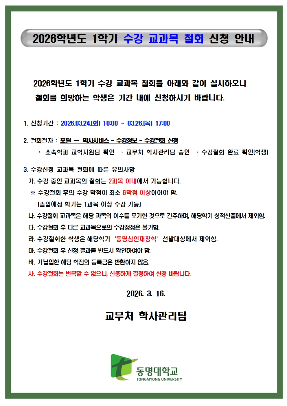 2026학년도 1학기 수강 교과목 철회 신청 안내