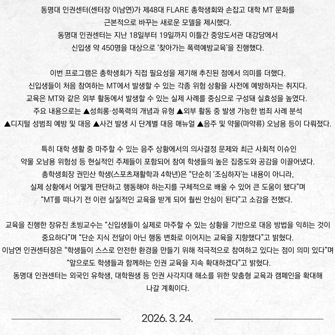동명대 신입생 450명, 인권 교육으로 대학생활 시작